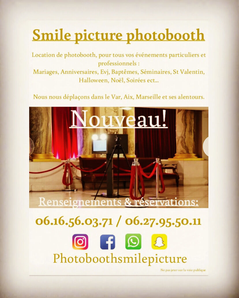 CALL +330616560371# Location de photobooth dans la région PACA (Bouches-du-Rhône, Var, Vaucluse...) pour tous vos évènements festifs. Immortalisez le moment lors de vos évènements amusants ! Profitez de cette sublime borne à selfie pour vos festivités: mariage, baptême, anniversaire, EVJF/EVJG, soirées, séminaires, repas d'entreprise, fête des mères, fête des pères et bien plus encore !!! Nous vous proposons une prestation complète et de qualité avec la possibilité de personnalisation en fonction du thème choisi, le partage et envoi de photos par mail. Nous mettons à disposition pour nos clients des accessoires amusants (chapeaux, lunettes, moustaches...) N'hésitez pas à nous contacter pour toute réservation et tarif, nous vous établirons notre meilleur devis GRATUIT.